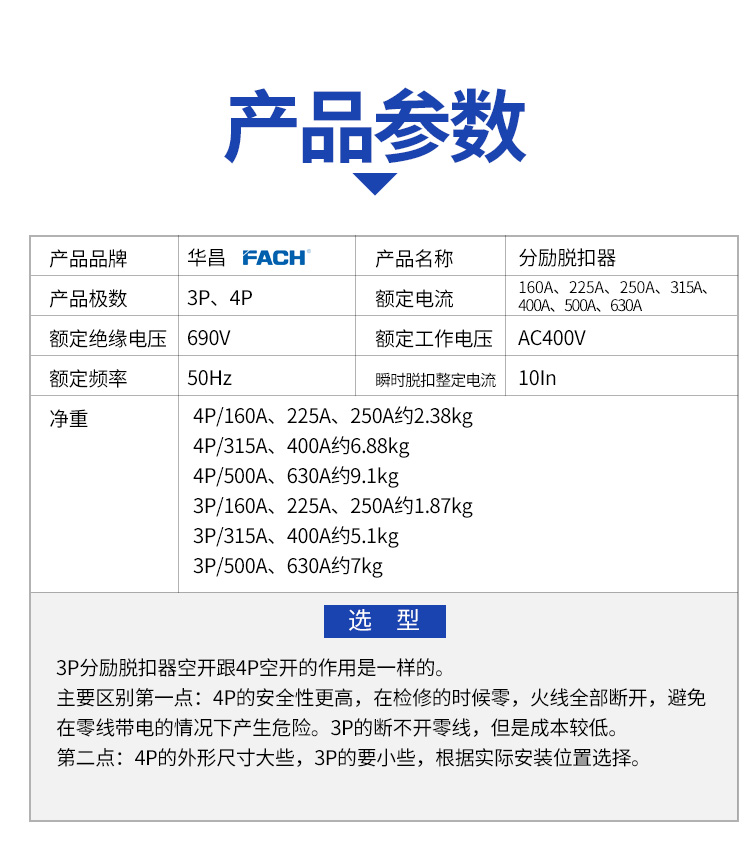 (3)4P和3P分勵(lì)脫扣斷路器的電流范圍:160A、200A、 225A、250A、315A、400A、500A、630A、800A等