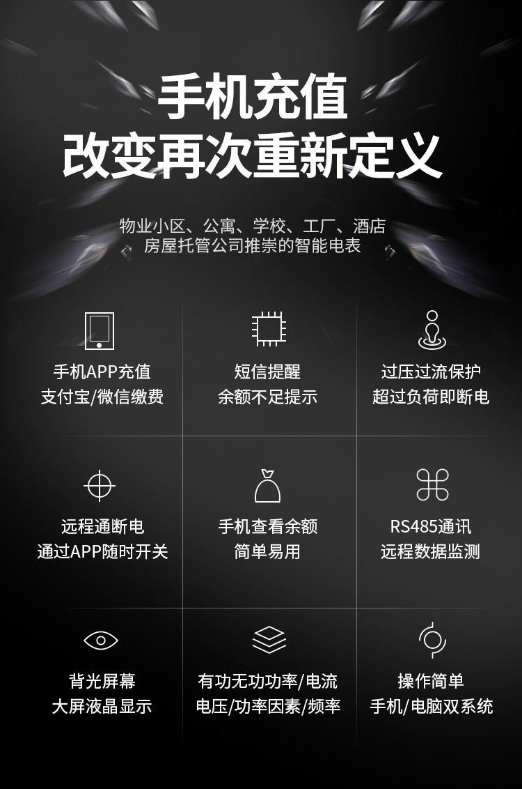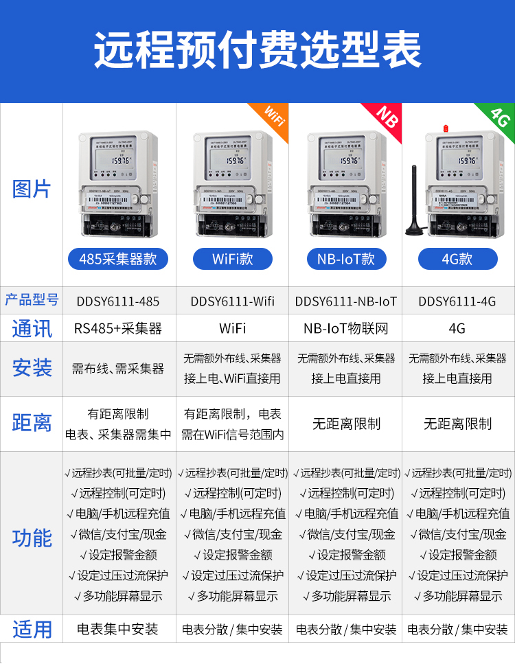 本公司DDSY6111/DDZY6111遠(yuǎn)程智能電表與本公司遠(yuǎn)程抄表系統(tǒng)和手機(jī)APP配套使用,遠(yuǎn)程抄表管理系統(tǒng)具有實時抄表、定時抄表外,還提供了設(shè)備管理功能,如告警、余額短信通知、遠(yuǎn)程充值、手機(jī)抄表、手機(jī)查詢、手機(jī)充值、預(yù)付費、后付費、自助充值機(jī)充值、遠(yuǎn)程拉合閘、各種查詢報表、統(tǒng)計報表下載等功能。
